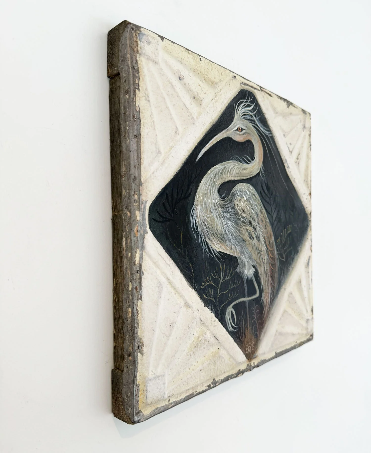 Medium: Mixed media on an antique American tin ceiling tile, circa early 1900s.