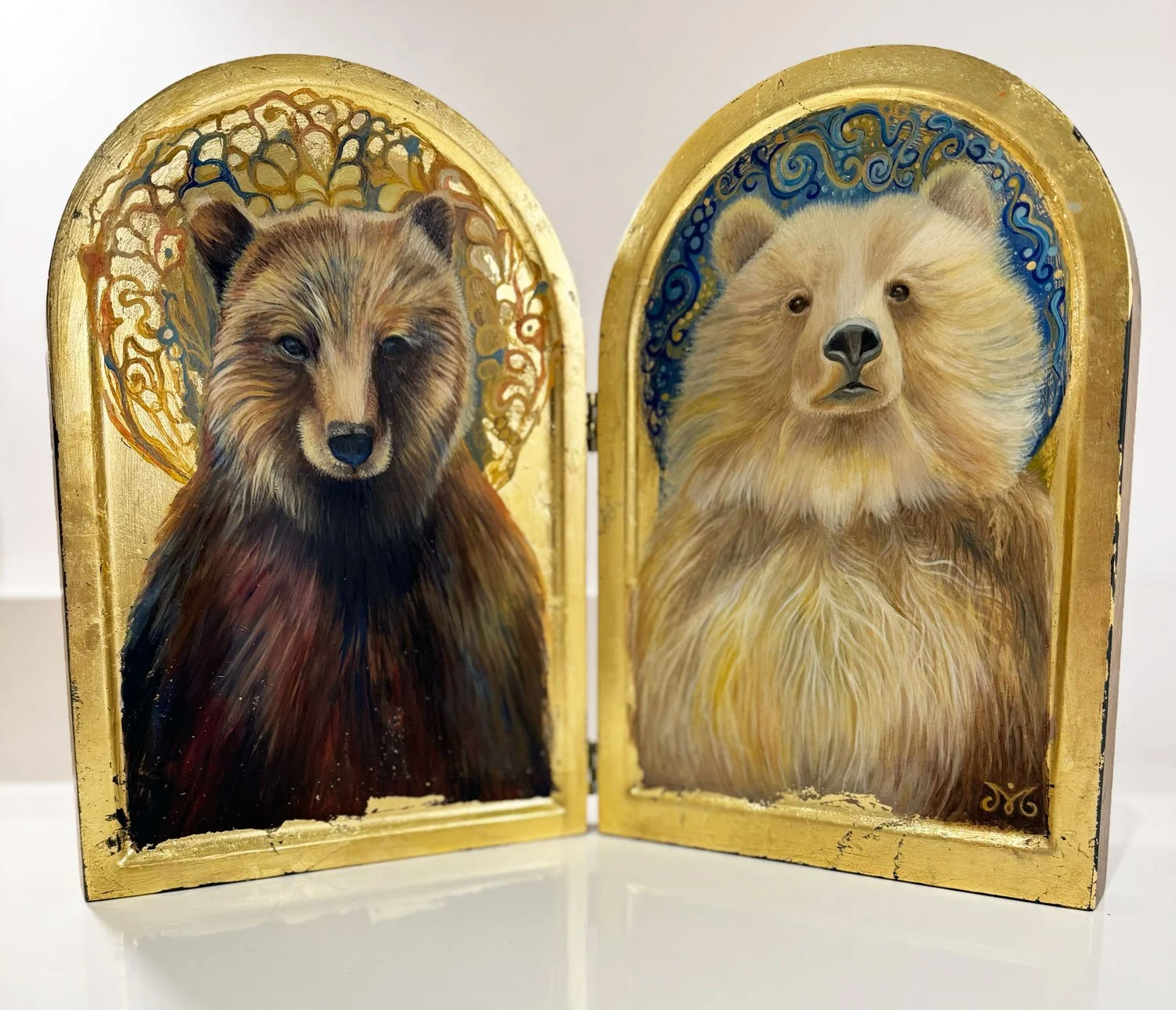 Mixed Media with gold leaf on a linden wood folding diptych handmade in Italy.