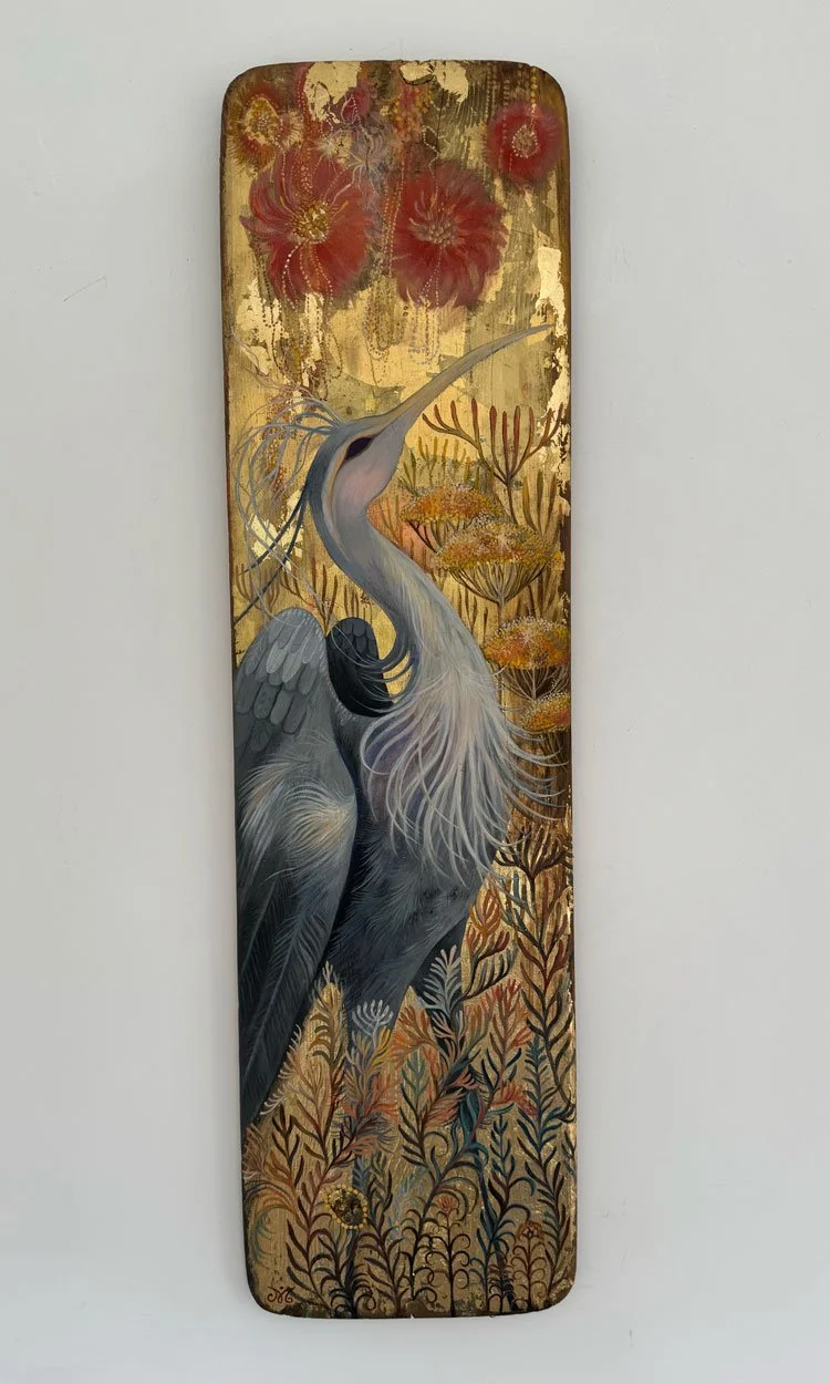 Mixed medium on an antique wooden potter’s plank, used in a terracotta pot studio. It has lovely worn soft edges from being handled and in use for so many years.