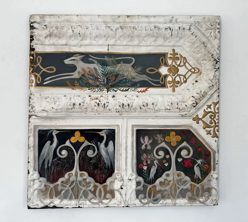 Acrylic and oil painting on a unique antique American tin ceiling tile circa 1900 with a wooden mount.
